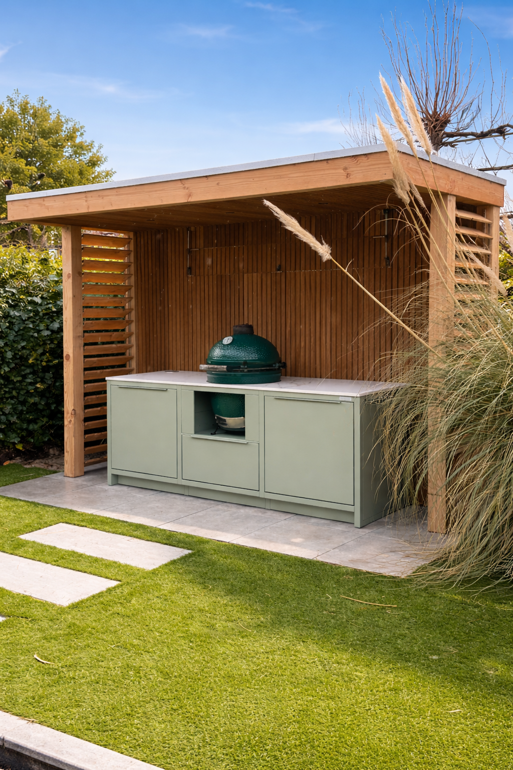 Het resultaat is een beschutte buitenkeuken die uitnodigt tot gebruik, ongeacht het moment van de dag of het seizoen. Een rustige, elegante plek waar koken vanzelf overgaat in genieten.
